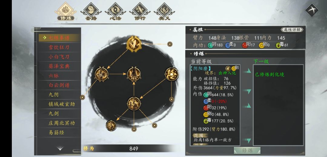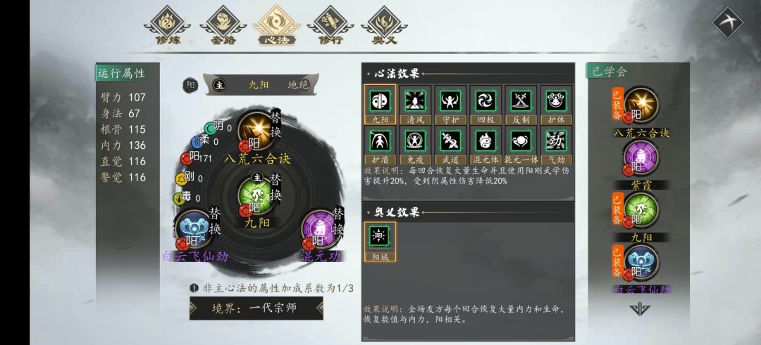 9.7 武学效果放在《武学录》里了,这里就不做赘述了,主要放在笼统的概括心法主要特点。作为构建玩法搭配的索引。 ★ 传送门 ● 武学效果、特性具体效果参考: 心法: 阳: 龟息术 · 蓝(神怆经){假死}{新手村接三招金手指} 神怆经 · 紫{复活}{新手村接三招金手指} 白云飞仙劲 · 紫(白云剑谱){连斩} 混元功 · 紫(傲剑三绝){四维+10%、霸体、回蓝} 少林上阳功{分摊伤害} 紫霞
