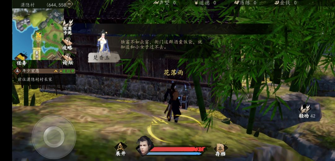 1.建号:天赋最好有麒麟臂,26以上悟性,第一条不是阴就行。医术10,根骨,臂力,内力,都要大于7,剑术10。难度一代宗师。 2.出生后先把树下箱子,商人后面院子里的箱子拿到(方法就不赘述了,论坛里很多新手村的攻略), 然后找村长,从山上的路回家,在树边捡佛珠,佛像后面拿宝图,另一边出来后跳到山那边屋顶拿箱子 ,亭子里找了心,打两场点到让你找药。然后回家,拌完嘴,屋里屋后拿箱子,继续山上走去散心