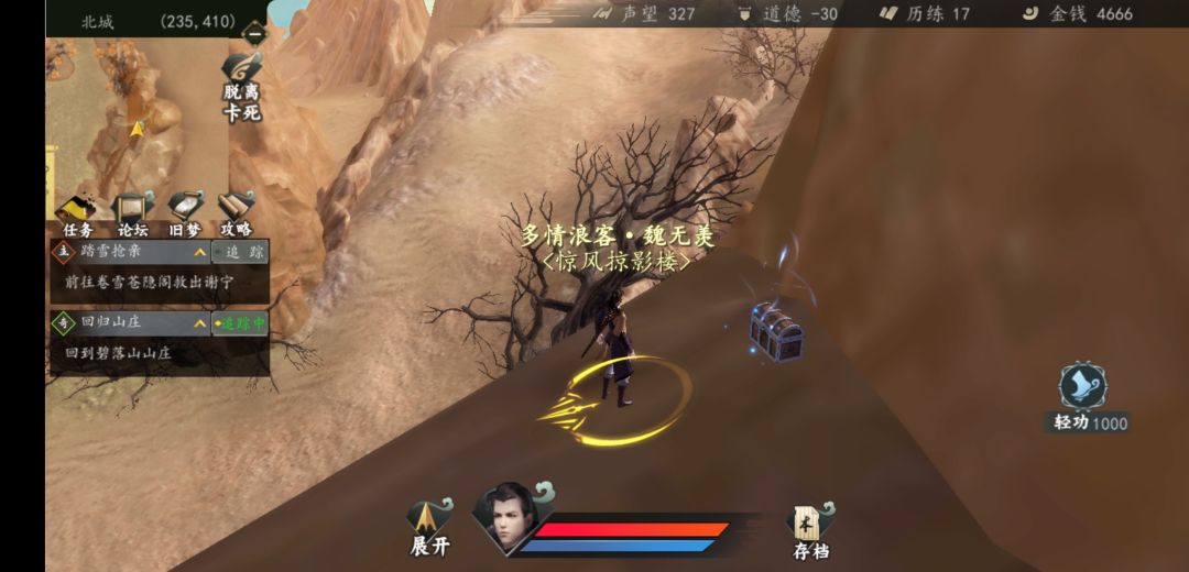 拳/剑,阳系 首先在下图的位置,对诗 然后点下棋 当你的棋艺到达80的时候, 就可以开启棋圣 这时候李微说他要回家 去下图位置 点击对话,然后会到下图 这个人好像是选择救 不救的话,这个请大佬们讲解 反正不救的话,可能没有后续 然后去下图 进去之后,点击那幅画进行对话,然后去下图 注意就这一块,你要打一个千年玄龟的 建议先存档,没有实力的话,还是不要先去了(ノД`) 因为等你得到武功之后,别人会来