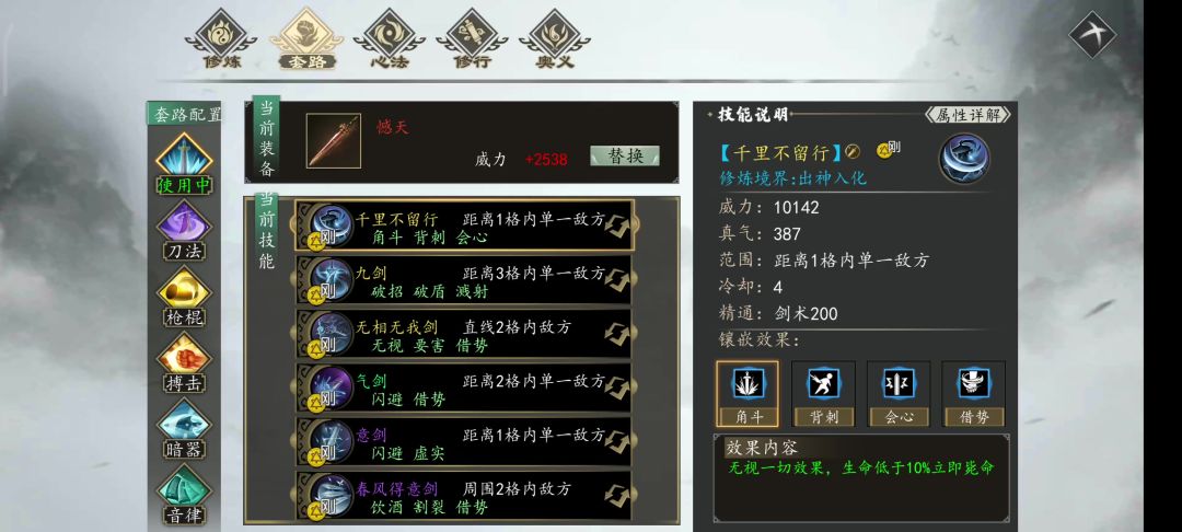 按照队友的武学及武学特性进行点评,优先级你们大伙见仁见智哈,强弱和人气度不分先后,你们看到的属性都是我拉满他们修为的图,部分队友因为之前打存档忘记截图没有属性图片请见谅,但是会依照印象点评。那么接下来就是正片了。1.申灵,入队即满级,但不知道因为什么原因属性低得离谱且无法提升,唯一一个可入队的用刀队友,武学特性中规中矩,也就属性烂这个缺陷,只能说当做吉祥物吧。2.崔澜. 被很多人低估的刚系剑客
