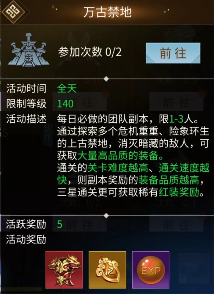 大家好啊,妙妙我又来了,妙妙每天都能收到小伙伴的催促想知道游戏上线的时间,还请稍安勿躁,重逢时刻不远就要到来了今天就给大家介绍一下游戏中的副本「万古禁地」玩法,深入禁忌之地夺取深藏的宝物吧~副本介绍-------->>>>万古禁地苍岚大陆上,有无数秘境禁地,暗含无尽杀机,却又藏有无数神装至宝。纵然前往此地者九死一生,却也时有强者满载而归。万古禁地是一个140级开启的1-3人团队副本,通过