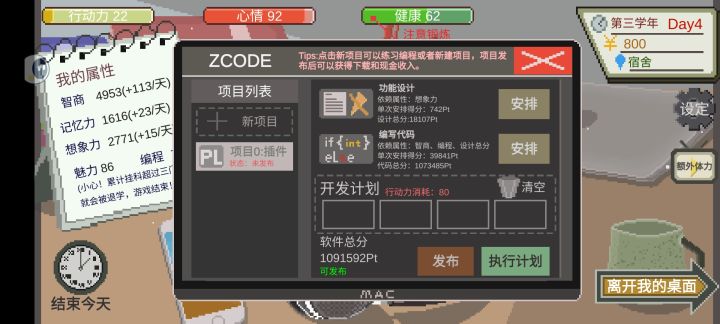 前置条件每天最大体力(前期不必最大体力) 睡醒140+ +咖啡50+网吧沙发20+网吧热狗40+西餐100+看广告100可有可无 共450+体 花费380元伴侣为打工小妹,伴侣加成打工获得金钱增加50%选科在大一大二可以选点易过的,不必选学分最高的,大三最高不要让心情健康分别低于75和80,会浪费大量体力攻略如下第一天去图书馆看书使记忆达到100,去食堂加50体力再回去把其中一个最容易