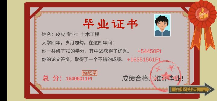 #下一站我的大学 小胡和菲菲有点难上手,就一直玩了几遍皮皮。试着冲了几次,看过网上有人打1个小目标的视频,但是没看出差别来。。。而且以前版本不消耗体力,可以一回合3次广告,但是没有网吧60体力,不知道现版本上限能打到多少。 整体思路就是一个传统的极致的打工攒钱,看过一些大佬的攻略,稍微改了一下,开局图书馆打工买西服,2,3回合稍微SL一下妈妈的零花钱(300+400),广告都用了,3回合结束20