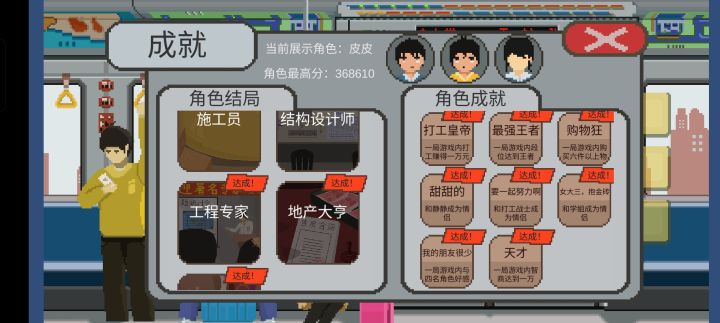 试了几遍,总算是结局成就全达成,皮皮这个角色给我的感觉就是一个普通人的故事,甚至于就是我的故事,未来如何,全部取决于当下,把握眼前的机会,就相当于为自己的人生添砖加瓦