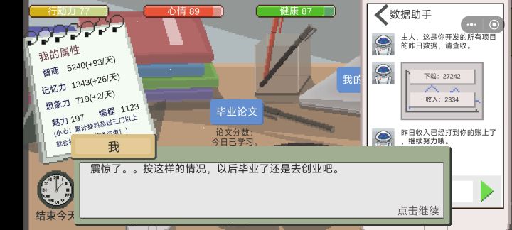 你是一个家境还不错的信息学大学生,今天你开学了。刚拿到2500块钱,选完三门最难的编程课后,你选择去新学校逛一圈。你先是来到情人坡(为什么叫情人坡?明明没有可攻略角色),遇到了一个男人——皮皮,你跟他聊了三次,发现你居然还能通过他加基础属性,你震惊了,明白了你大一大二不能错过的那个他(你明白了这里为什么叫情人坡,因为皮皮这个软性外挂在大一大二不能错过)然后,你去公园,发现了另一个男人——小伟