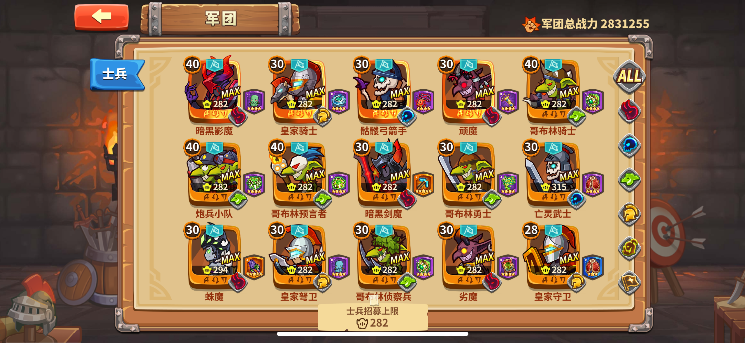 因为这关没有影魔,所以练了哥布林勇士,而不是哥布林侦察兵,哥布林勇士练到30耗费不了多少资源,打这关确实好用 长矛40,小炮40,预言者40,猪骑30,哥布林勇者30,装备全40