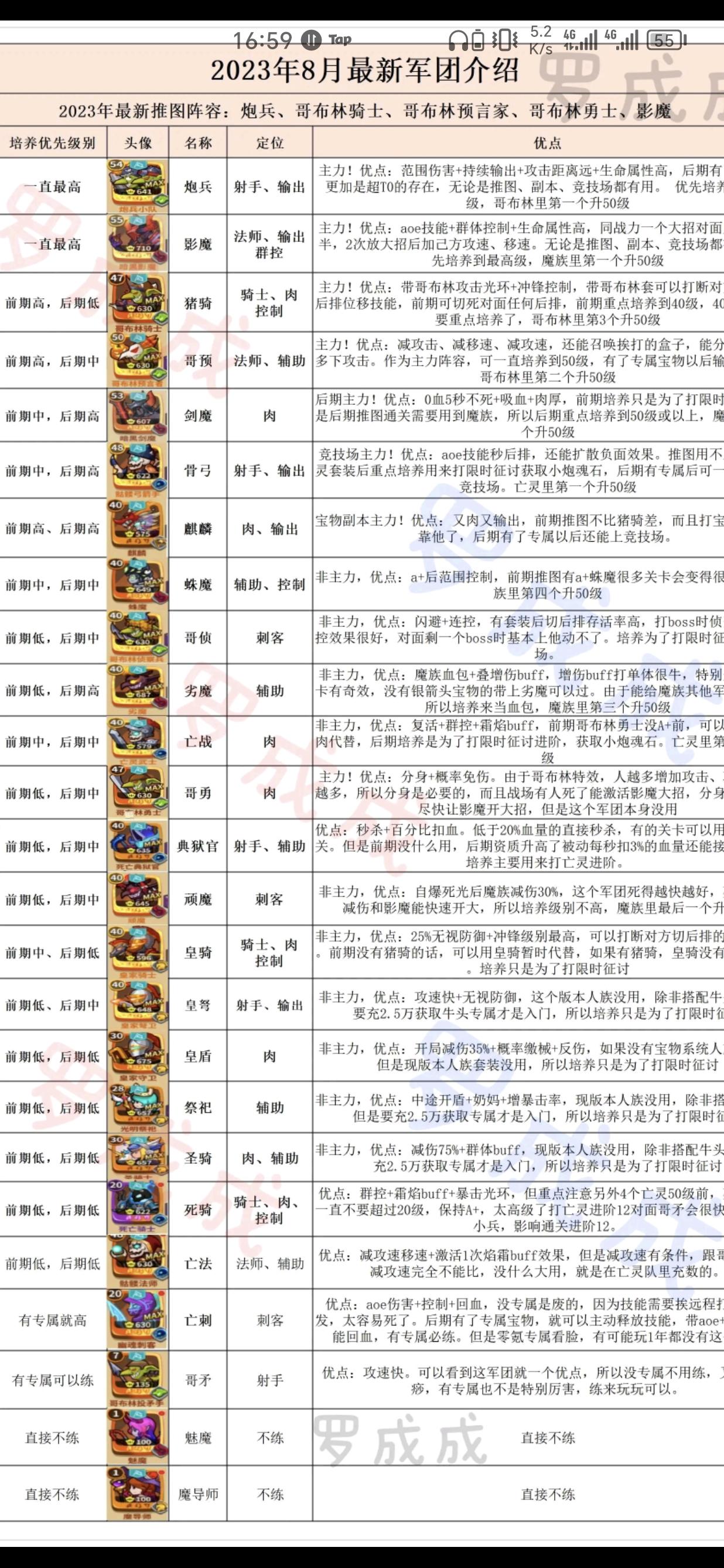 1.不要雨露均沾式的养兵,就养五个兵,否则浪费时间 前期推荐:1.影魔加哥布林四个(矛,侦除外) 2.人族五个(魔导师除外) 3.哥布林五个(矛除外) 4.魔族五个(魅魔除外) 上面几种都行,算是都能推图和打一种进阶的至少,第一种损耗最大也最猛,其他看自己喜好也能玩,至少前八章不会卡个关卡一天以上。 原因:推图进度决定资源和魔晶,后期想养其他的快的一批,两三天就能赶上你半个月,前期雨露均沾一点