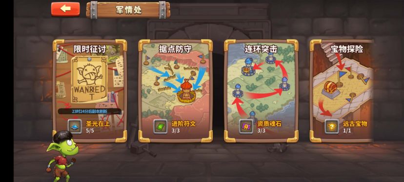 本文为军情处前三个副本的合并攻略,感谢作者钟小强以及Z的精品攻略! 军情处界面介绍: --------------------------- 通关对应主线后开启对应的前三个副本: 1.限时征讨(2-10解锁);2.据点防守(2-20解锁);3.连环突击(3-10解锁),介绍一下各副本的产出和打法 一.限时征讨: 1.主要产出: 魂石(打满普通一周3个a魂石)、沙漏若干(魔晶的主要来源之一)、瓶盖(