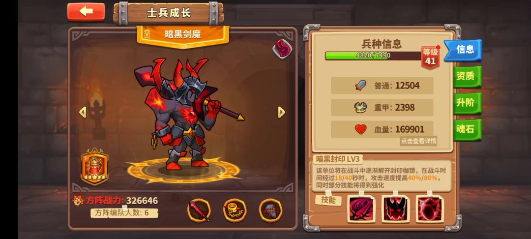 这一套阵容大家都能凑出来吧,两稀有兵种剑魔蛛魔还是S级,宝物只需单孔,宝物最高也才10级,没有什么三暗伤加成、三火抗词条等要求。