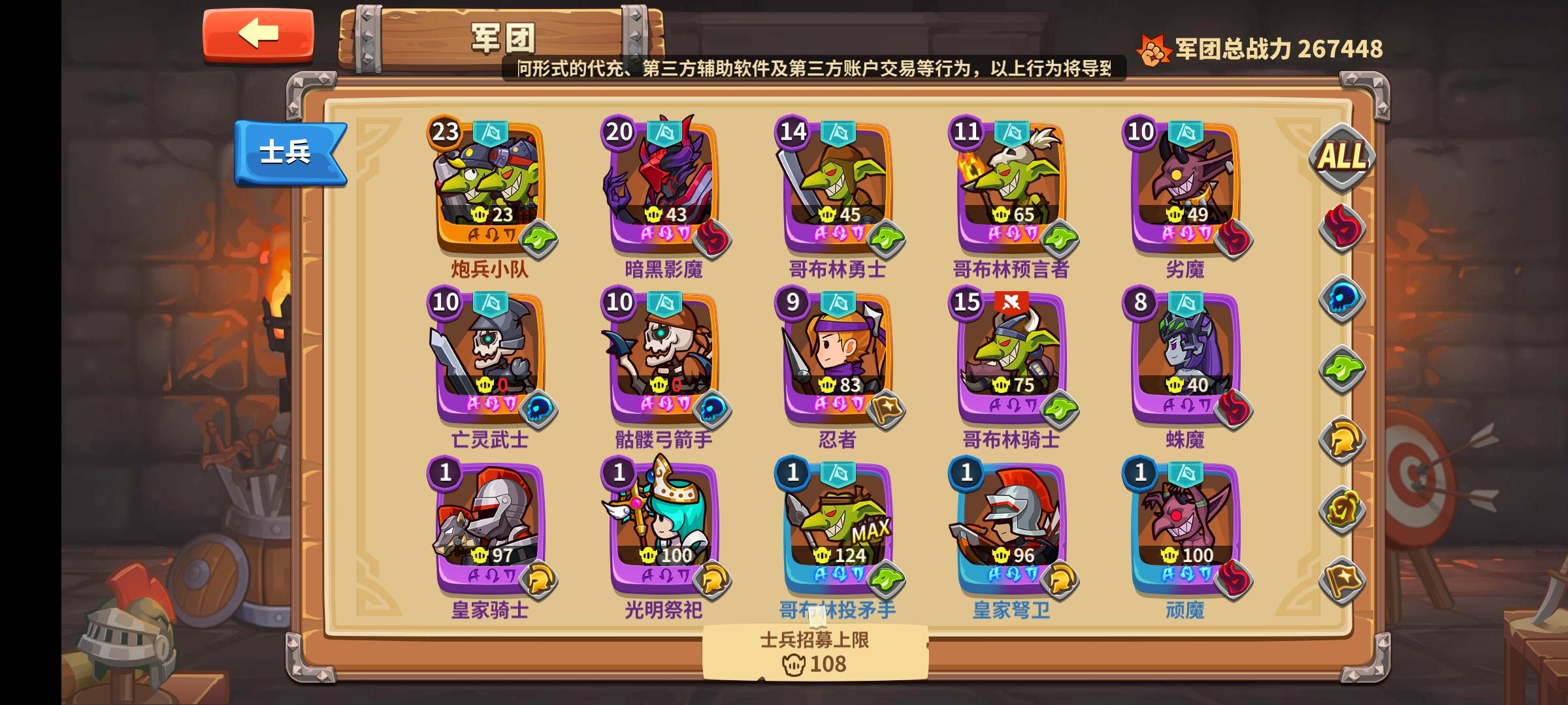 给大家新人小伙伴一些建设性建议: 开局免费强制10连选择影魔,然后部队以哥布林为主,影魔有一个特性,每当死一个兵他会增加攻击力,那么你的影魔就会很强,而且影魔的身板比较好可以当二层防线用,其次是哥布林骑士,炮手,勇士重点培养。再有就是哥布林预言者,只要这5个能够养好其他,再养也都来得及,因为这5个是我氪金氪下来现阶段最好用的一个搭配,不要去相信网上什么三皇啊,相信我,群殴才是最好的出路,然后可以