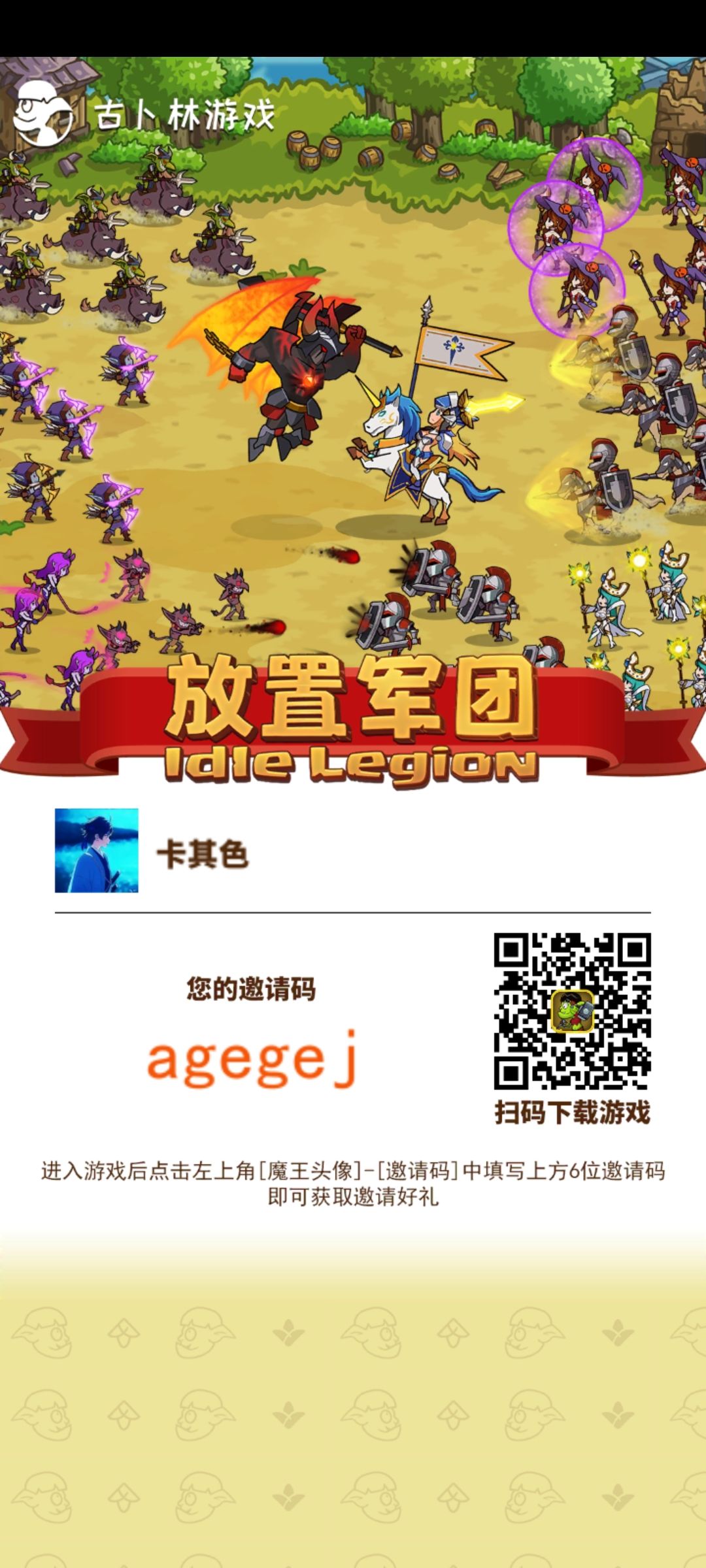 邀请码:jxagfn 第一:免费福利 填写邀请码: jxagfn 领取1000氪金,我得一个古卜林 注册新玩家24小时内使用可领1000氪金,一定不要超时!后期加好友也可以互相交易高价回收中心物品。 重点:下列兑换码全部亲测有效,算是目前全部有效码了 另外关注微信公众号:古卜林游戏,根据公众号提示输入以下内容获取福利 1.放置军团666 (200氪晶) 2.FZJT666 (10000魔晶) 3.