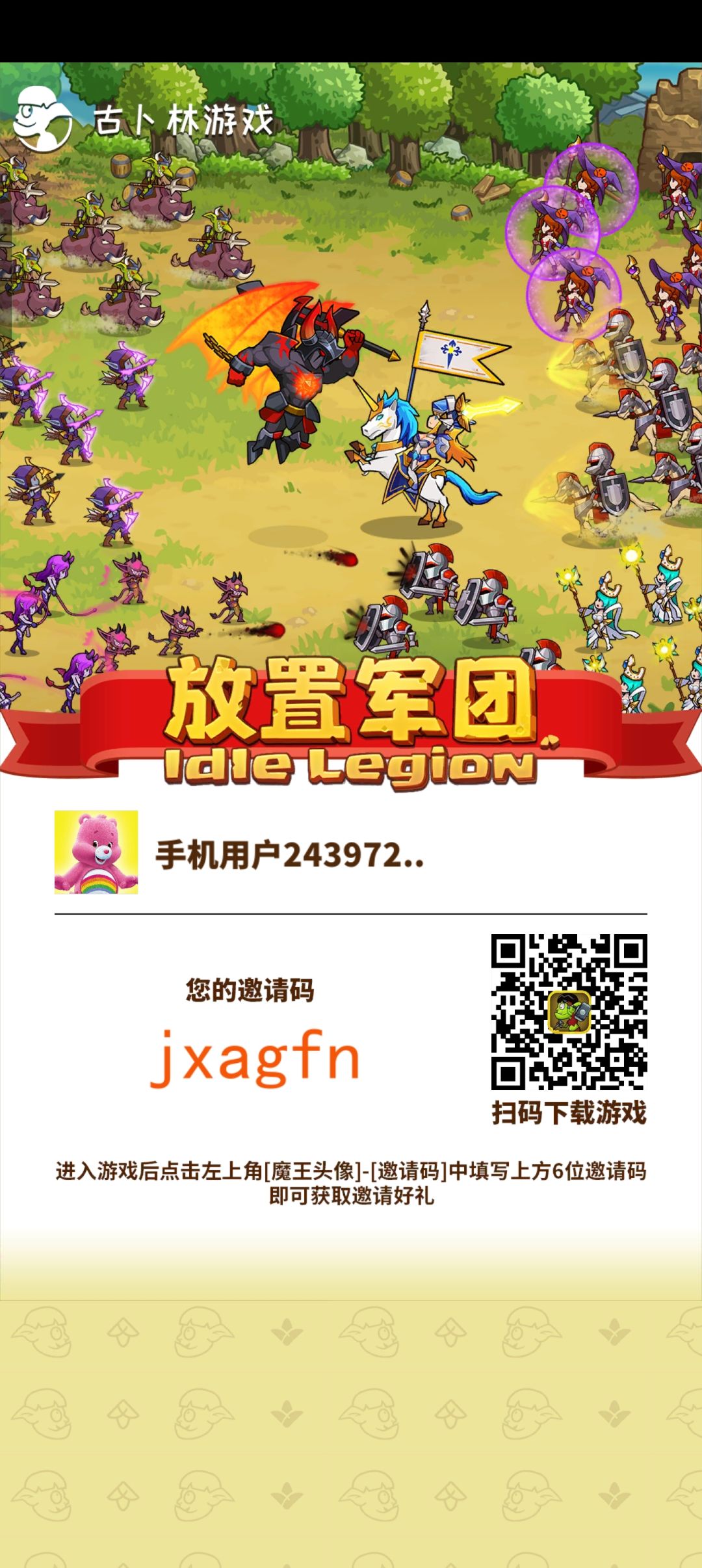 新玩家建号24小时内,在游戏内填写邀请码:gwugzu得1000氪晶!。 和我加好友,后面可以一起玩,在回收中心可以互相拜访,最高100倍收益! 5级以前不满意开局抽可以重置存档。 1.放置军团666 2.FZJT666 3.可靠的布道者 4.头秃古卜林们 5.我会回来的啊 6.奉上诚意祝福 一。 【开局】 1.进入游戏后,不要领取任何礼包,直接跟着主线走,先打到1-15,新手引导会强制进行一次十
