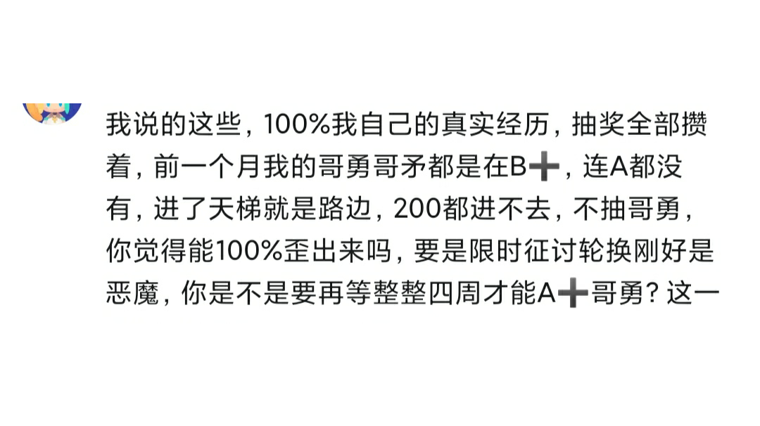 这位朋友说无所谓我发帖,那么我就发一回,各位当图个乐,原剧可进我动态那则新手攻略补充帖查看☞本人仅代表个人观点阐述分析并原图列出这位“一个月拿不到【哥勇a】”朋友的原话这是第一句发言,他的意思是上帖新手22天的账号理应排在他的竞技场,比他那边战力低的竞技场都是“辣坤竞技场”第二句开始说宝物套装出货率和他引以为傲的骨队刺专暴打无套哥无影魔的光辉战绩,一下子把我吓到了他可能是想指责