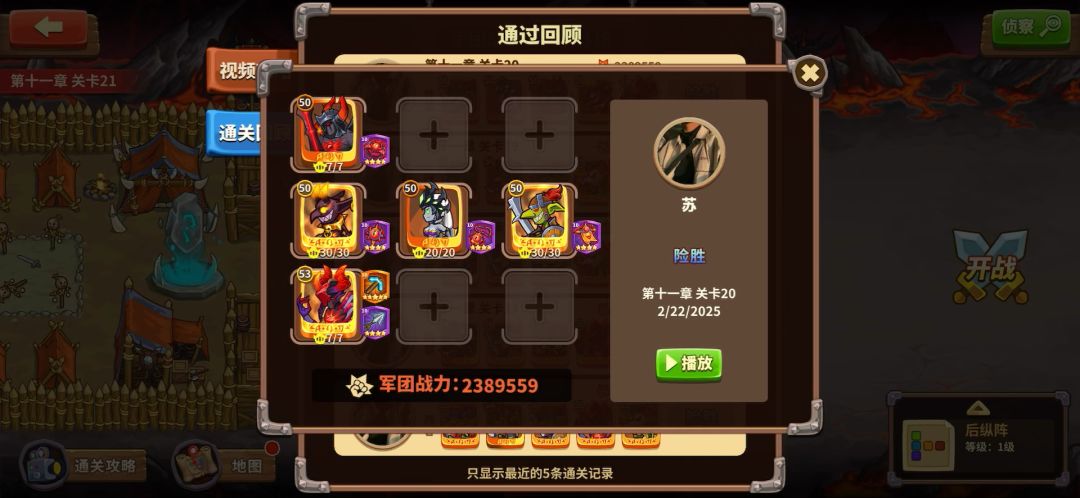 189万战力过11-20人王 影魔练度高点,其他的一般,宝物用加血量的存活时间长点 上猪骑整个阵容的站位分散点,阵容分散不会被人王一波带走,靠宝物输出 之前一直用勇士,赌影魔开4个大,打了几十次没看到一点希望就换一种阵容