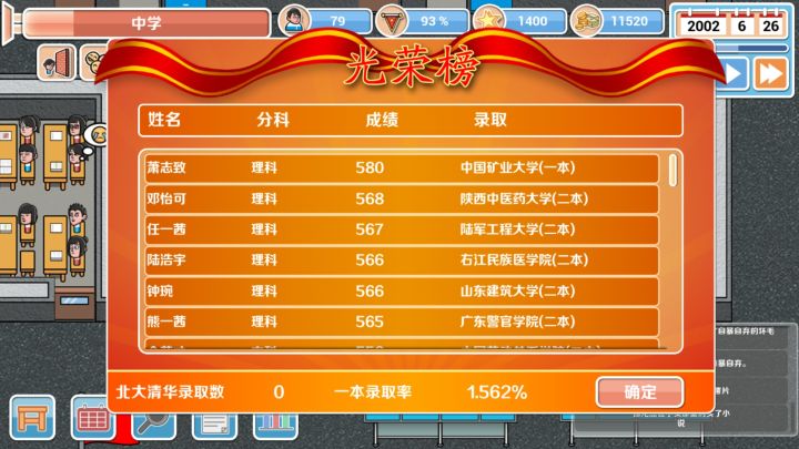 就目前的体验,成功一次高考,没有一个一本,全是二本,唯一有两个落榜。感觉内容过于单一,操作设置稍微差点火候。而且我目前发现一个bug,有个同学,上课打牌,然后点快了,没有惩罚他,直接点了确定。然后他头上一直有个感叹号。一直没办法消退。