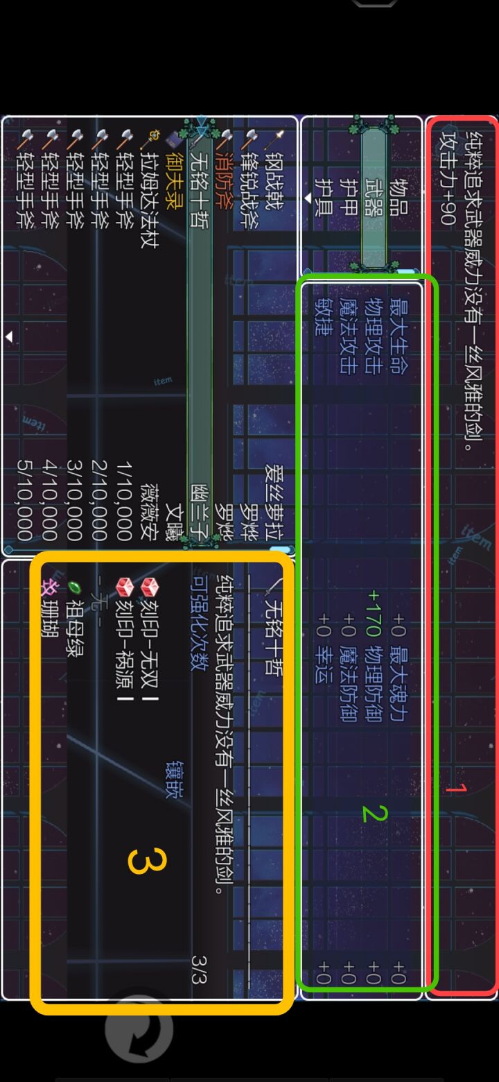 框1.装备描述,数值一点都不要信框2.装备数值面板,是基础数值+镶嵌刻印/圣痕/晶 石的总和框3.装备名称;有些特殊属性会在此处标出,如消防 斧头的火抗、御fu录的暴击等;可强化次数,生来固定,最多为5次;镶嵌物……………………………………………………………·刻印(铭文)可以升级,在村里神秘商人处买图纸,家里有合成台·镶嵌和强化能有效提高练度,镶嵌物是可以拆下来的,更换装备前最好把镶嵌物
