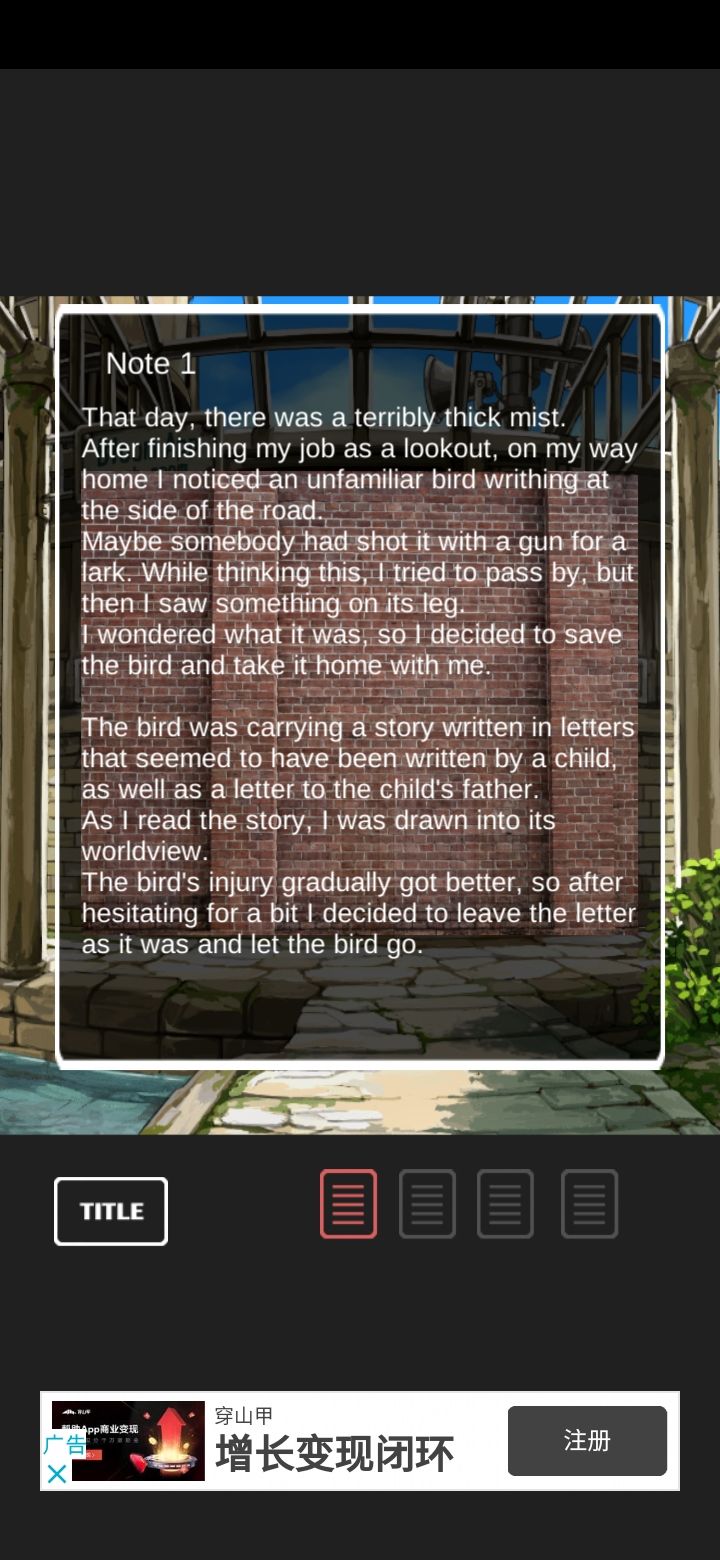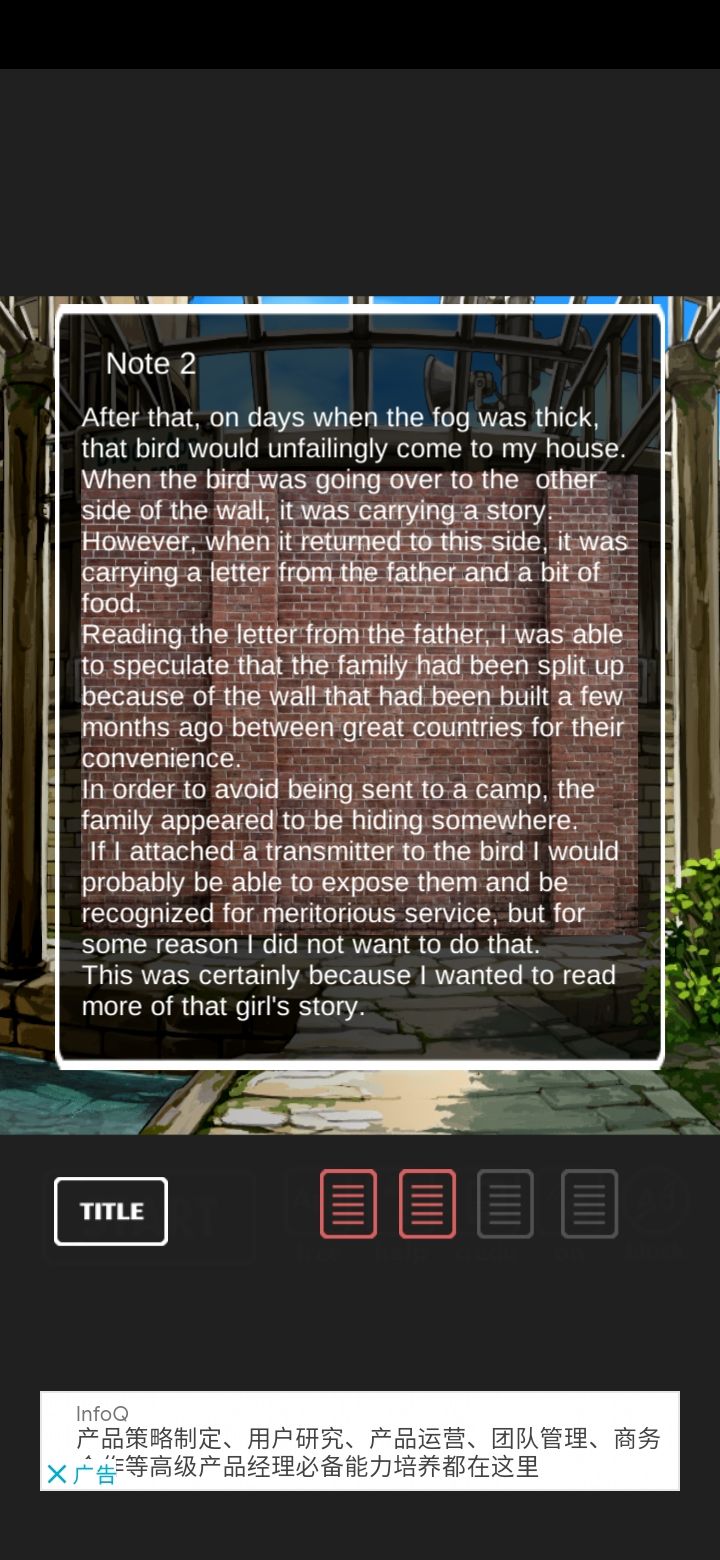 玩完了评价一下剧情就是主人公穿梭在小女孩编织的童话世界里,但小女孩其实和她父亲因为战争的一堵墙分隔两地,靠鸟儿书信往来,最后父女俩都被抓进集中营了,传达了浓烈的反战色彩。同时也告诫人们处在逆境中依然可以坚持快乐,还蛮疗愈心灵。二周目略短,没什么玩头,但总体上不落俗套,还挺好玩,推荐。啊感觉这种风格的作品很适合扑家汉化喔!【以下为第四道门攻略】........................