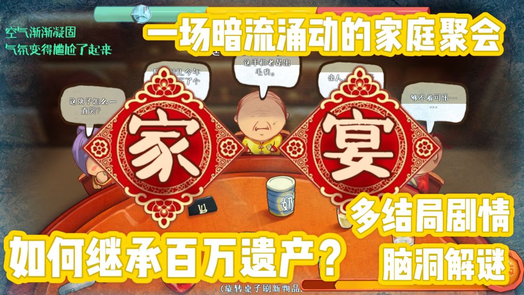 一些高分建议1.(个人建议)从左到右一个一个来,不然会很急很乱2.可乐、酒是分有没有开封的,尽量拿开封了的!!3.按摩棒也分有没有电池,最好拿有电池的!4.二和三两种情况如果遇到东西就在附近的话可以直接用5.妈妈咳嗽就是要给她药,小姨说孩子哭了就给奶粉,大侄子说恭喜的话就给红包,东西洒了或者擦嘴纸巾和湿巾(蓝色小方块)都可以用6.大家可以先把气氛值升到红色(不要到顶!!),然后在多余时间用来吃饭7.热水+茶叶=茶 空奶粉瓶+奶粉=一瓶奶粉没有电池的按摩棒+电池=按摩棒 未开封的可乐+万能开瓶器=可乐 未开封的酒+万能开瓶器=酒