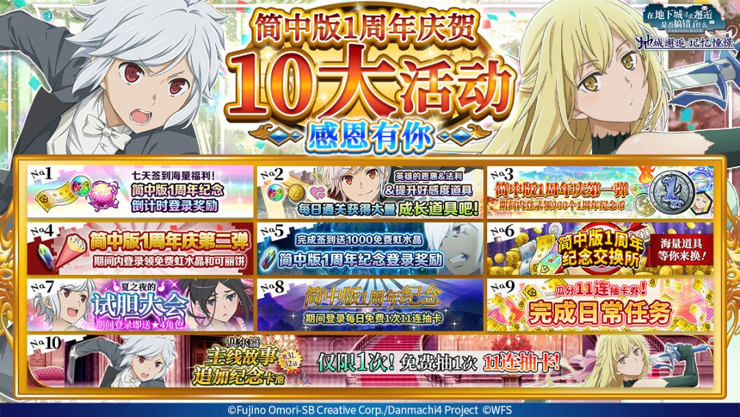 各位冒险者大人元旦快乐!! 十分开心能和各位冒险者大人一起迎接新的一年! 我们准备了特别的礼物送给各位~ 所以新的一年请还要继续一起冒险喵~~! 元旦礼物:200免费虹水晶、⭐4必中抽卡券*1 派送对象:全服玩家 领取截至时间:2021年1月2日23:59 礼物会发送至各位的礼物箱,请记得领取喵~! ============== 《地城邂逅:记忆憧憬》国服开服活动火热进行中!累计登录即送500连