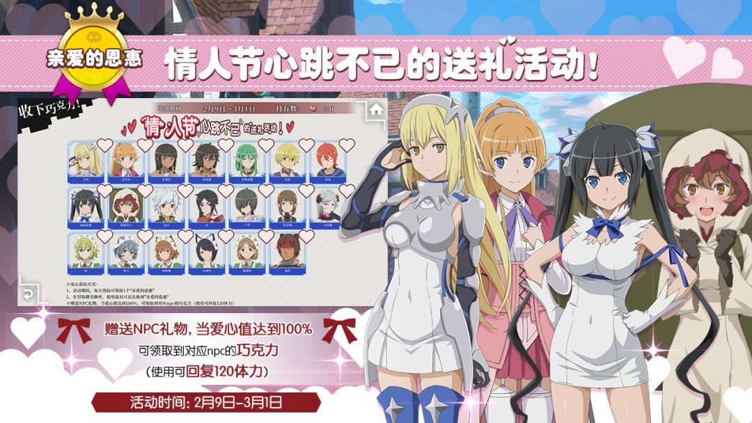 各位冒险者大人好o(=•ェ•=)m 这次欧拉丽开展的情人节活动中,有一个比较特别的活动呢,冒险者大人可以送礼物给心仪的角色来换取巧克力~! 听说当爱心值达到100%的时候,还会触发特殊的剧情喵~~! 今天给各位带来的情报就是有关于这个 “情人节心跳不已的送礼活动”的喵,让我们一起来看看吧~~ 活动时间: 2021年2月9日10:00—2021年3月1日13:59 活动内容: 1、爱心获取方式: >