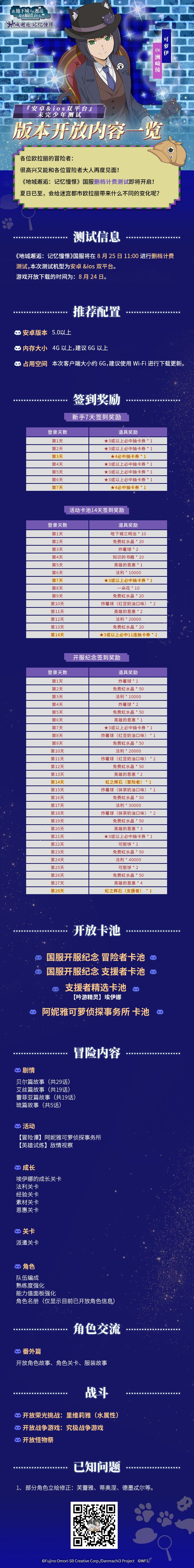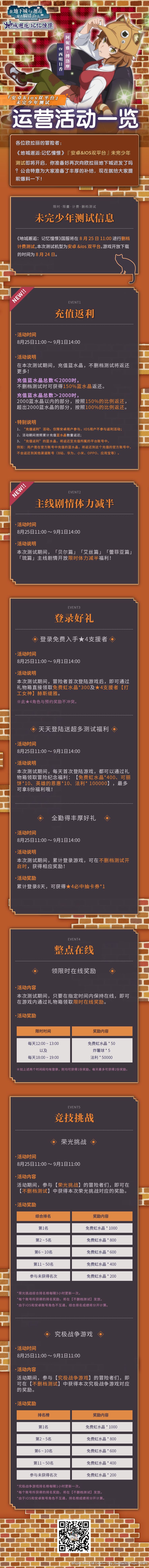 各位冒险者所关心的【国服版本内容】即刻公开! 💗想知道本次测试开放哪些角色吗?💗 (有我 有我 快看我 [doge]) 💗想了解签到奖励都有哪些吗?💗 或者有任何其他疑问,请跟帖回复哟~~~~~~ 👇👇👇👇👇👇👇👇👇👇👇👇👇👇👇 【下期预告】: 未完少年测信息大公开-运营活动介绍 【历史回顾】: 【未完少年测试Q&A】 《地城邂逅:记忆憧憬》8月25日开启未完少年测试! =============