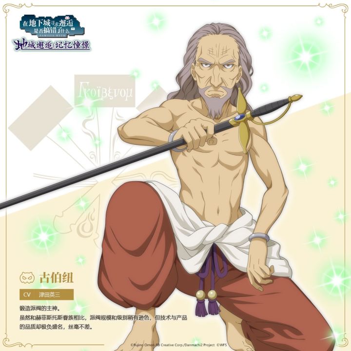 大家好,我是您的冒险顾问埃伊娜。4年一次的2月29日,大家有做什么特别的事吗?今天要介绍的这位人物,我猜他昨天一定也会是十年如一日地锻造着武器。他就是另一个锻造系派阀的主神——古伯纽。========种族:神眷族:古伯纽眷族声优:津田英三锻造派阀的主神。虽然和赫菲斯托丝眷族相比,派阀规模和级别稍有逊色,但技术与产品的品质却极负盛名,丝毫不差。许多第一级冒险者喜爱他家的产品,