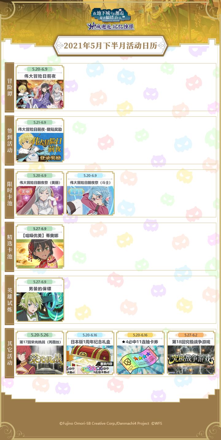 各位冒险者晚上好呀!五一黄金周过去啦,冒险者大人们将婚礼大作战活动进行得怎么样了呀!今天为各位大人奉上的是5月上旬的活动日历,重要的时间节点都已经为各位大人标好啦,请各位大人记得按时来欧拉丽参加活动喔(<ゝω・)☆ ~5月上旬的活动日历就是这样了喵,欧拉丽5月上旬主要涵盖了婚礼大作战限时活动呢~~冒险者大人们不要错过喵!今后也请多多支持《地城邂逅:记忆憧憬》!
