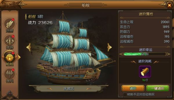 熟悉了陆上作战,我们也要开始准备征讨占领我们领海的魔物,在准备海战之前有很多事情我要先和你交待清楚。拥有船只方能驰骋大海,在海战玩法中船舰是唯一的战力标准,船舰的战斗力越高在海战中的战斗力就越强,而如何打造自己的船舰可是一门大学问。消耗进阶材料可以提升船舰的等阶,高阶的船会变的更大更精致,也会变得更加强大。我们的船舰由五个部件组成:甲板、龙骨、船舵、船帆、船炮,只有所有的部件都强大船舰整体才会强