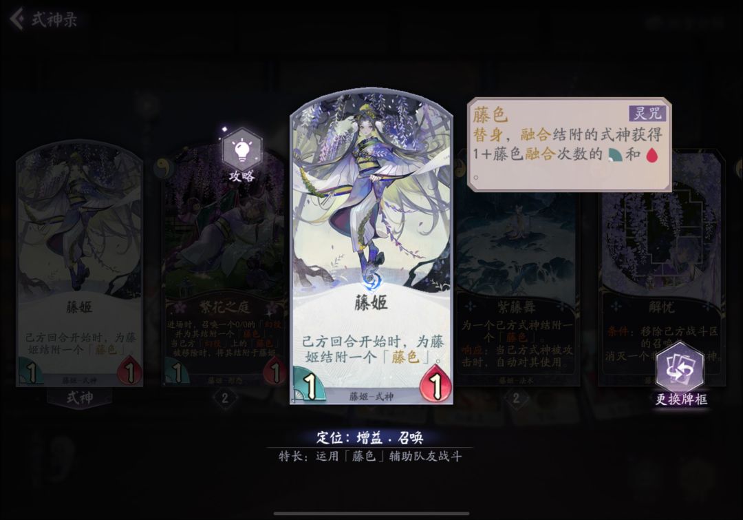 不愿随波逐流,你我遍都相同 大家好 我是狸猫会新人 小果酱渣 今天给大家带来的是 【藤姬解析】 ★藤姬独特能力 藤色: 类似一个加身材的盾,式神血量变0盾就破了,恢复式神没有结附藤色之前的身材。也就是藤色给了式神两条命。 一.单卡 ①本体 1-1超级弱女子身材 ★己方回合开始给自己叠加藤色,越早点亮藤姬收益越高。 ★藤姬有大量的召唤物站场,所以自己身材很垃圾也无所谓。 ②繁花之庭 ★战斗区召唤一个