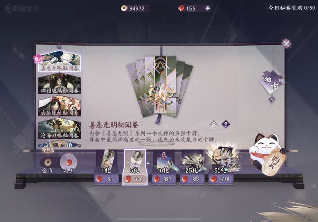 当客人们进入《阴阳师:百闻牌》的世界,通过新手试炼了解了游戏的基本操作后,很多客人依然对《阴阳师:百闻牌》的游戏玩法不太了解。那么新手应该怎样做才能快速提升自己呢?今天就由纳豆酱带客人们了解一下。 变强的基础——抽卡 客人们可以在“百闻馆”中,通过“秘卷”来抽取卡牌。一札“秘卷”可以开出一个随机式神的五张卡牌,最少可以获得两张R卡或一张SR卡,还有几率开出稀有的SSR卡牌。 抽卡的“秘卷”哪里来 “