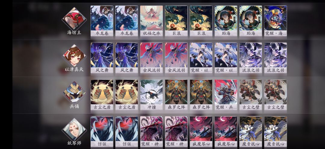 阵容名: 海坊主 祝福之水 (1) 蹈海 (2) 巨浪 (2) 觉醒·海坊主 (1) 水龙卷 (2) 以津真天 流浪之羽 (2) 觉醒·以津真天 (2) 风之舞 (2) 金风流羽 (2) 兵俑 森罗之阵 (2) 古尘之壁 (2) 觉醒·兵俑 (1) 古尘之盾 (2) 冲撞 (1) 妖琴师 觉醒·神乐歌 (2) 惊弦 (2) 疯魔琴心 (2) 魔音扰心 (2) 阵容码:MTAxXzYyNTMzODR