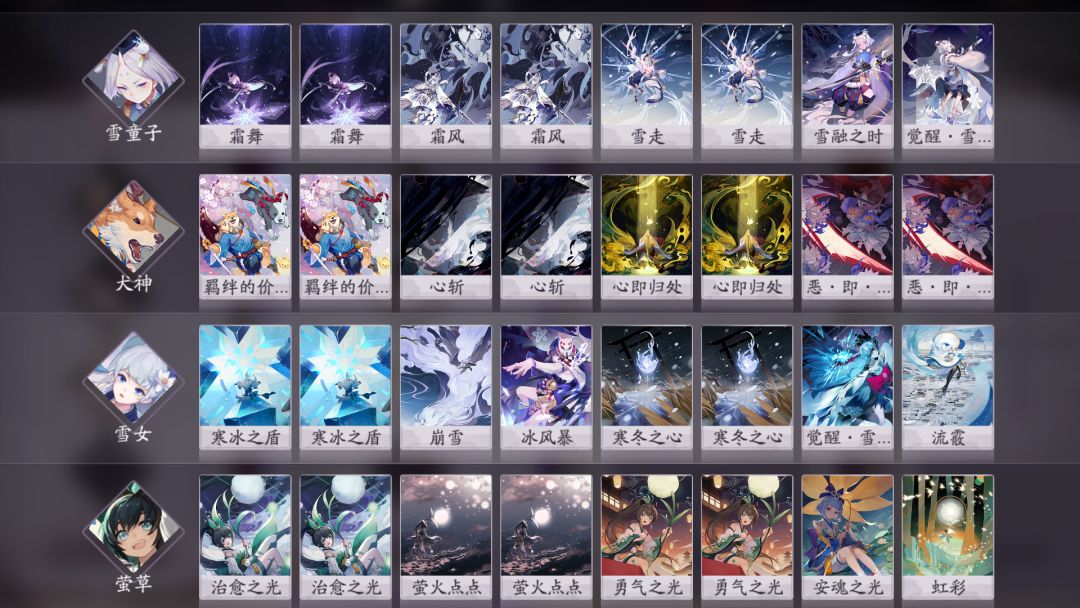 角色定位:犬神:抗伤害,爆发。萤草:群体回复,鼓舞,过牌,产火。雪童子:爆发,减免伤害,眩晕。雪女:控场,点控,补刀。 卡牌数目:14张一勾卡、12张二勾卡、6张三勾卡。 卡面解析:雪童子:免疫眩晕角色战斗伤害,可无伤解敌方战斗区式神。霜舞:高攻战斗牌,眩晕可瞬发,达到高额combo。霜风:加攻加护甲战斗牌,对敌方牌手造成伤害时眩晕敌方牌手(敌方所有式神不使用战斗牌无法进入战斗区一回合),配合觉醒