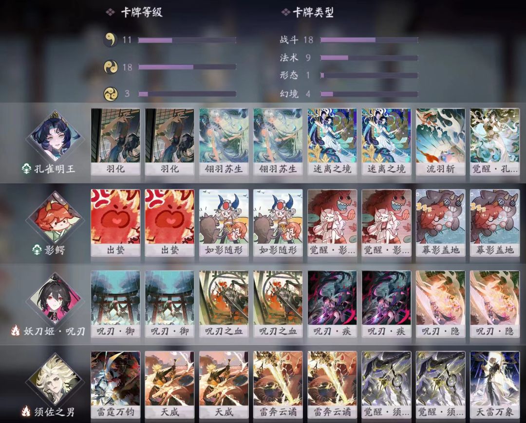 先明言,可以说是搬运亓哲的卡组。 一、卡组构筑。 1、孔雀明王。 不带祈神之舞、离笼曲。孔雀明王是典型的快攻,对快攻而言,形态牌往往亏伤害,即便祈神之舞保住1~2回合,也不过是持平,被解不仅拖累自身节奏,还亏手牌资源。 不带荆棘舞。纯粹是模型差,不应该由孔雀明王承担解后场任务。 重要机制与bug:SSR在孔雀攻击3点以上破甲式神时,即使没有三勾,也会触发永久+1攻。三勾时,因为觉醒插入阶段同为“攻