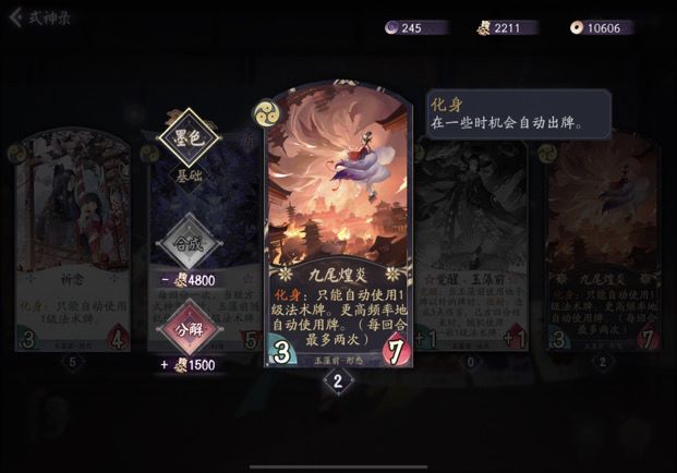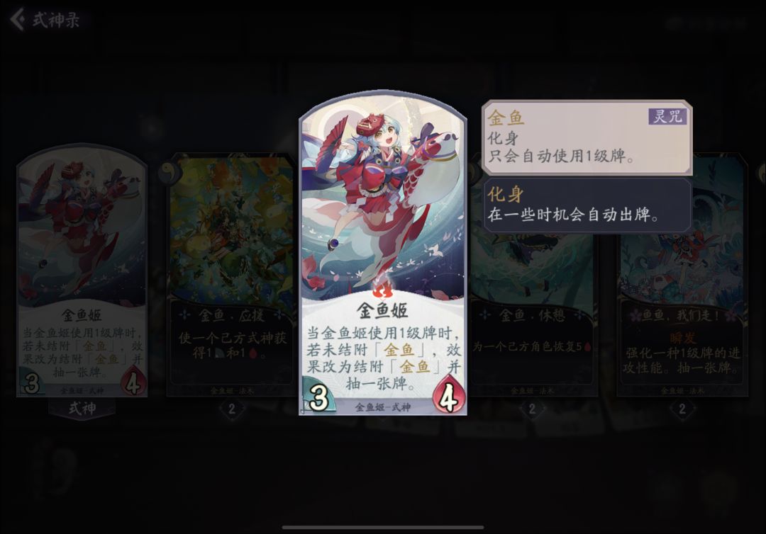 不愿随波逐流,你我遍都相同 大家好 我是狸猫会新人 小果酱渣 今天给大家带来的是 【化身机制解析】 一.金鱼姬 二.玉藻前 三.八岐大蛇 四.帝释天 五.荒骷髅 ★化身效果★ ①能触发化身那么这个式神身上会冒光。 ②化身会在 己方回合开始,出牌,出击,的时候 概率使用一张式神自己的牌,比如金鱼姬就只会用自己的三张一勾牌。 ③使用的卡牌是凭空出现的,不管你卡组构筑,手牌或牌库里有没有,就是凭空自己用