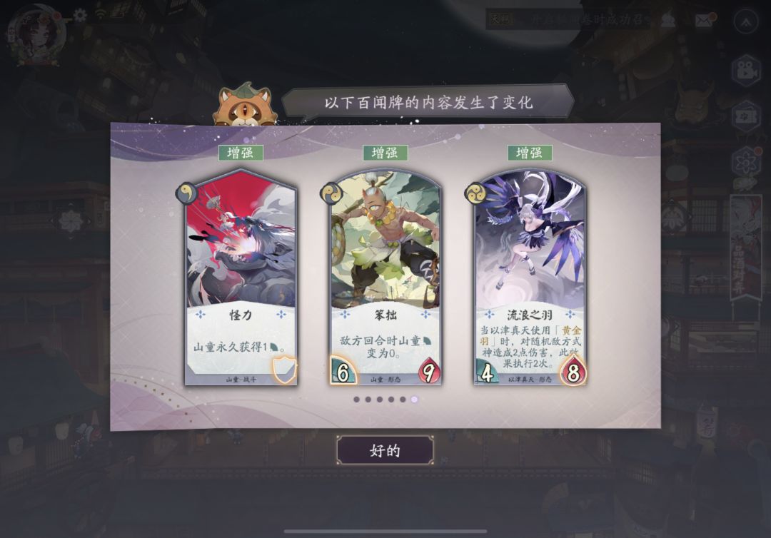 不愿随波逐流,你我遍都相同 大家好 我是狸猫会新人 小果酱渣 今天给大家带来的是 【平衡点评】 ★主要加强倒计时,其次运势。 ★难以触发的增强手段进行改动。 ★雪女斩杀能力大增强。 ★兵勇,额,感觉没啥用。 ★山童回调,增加抢血能力。 ★巫蛊师多了个结附牌。 ★削弱金鱼&蟹姬。 一.单独分析 ①山童 山童的速攻卡位【怪力】【笨拙】是必带,是一波纯加强,目前紫岩体系相当多,山童速攻唯一能抓的就是还在