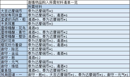 因为看到群里朋友刷新了八次杂货屋刷到了残局图谱,却没有材料换取,于是整理了下杂货屋剧情宝物合成所需材料列表。 最基础材料是清酒与奉为达摩铜币,主要获取途径为天梯与每日任务。 杂货店货物列表会在每日6、18、24点刷新,也可以使用进货请求书手动刷新。 杂货店剧情用品一栏货物用作完成特殊委托,解锁秘闻之间剧情。 虽然想必现在大家都已经推到五六关了,而且其实也没有多少材料,但既然整理了还是发一下,希望对