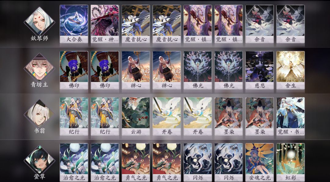 式神名称:妖琴师青坊主书翁萤草 式神搭配思路:萤草是前期过牌的保证,而后期还能提供宝贵的鬼火,本身形态牌的瞬发效果让我们回合内能够多使用卡牌,增加操作余地。 青坊主在提供了优秀生存能力的同时,本身的形态牌也具有过牌能力,为我们赢得宝贵的回合数。 书翁是本卡组的核心,觉醒后采用抽牌的获胜方式让这套卡组显得与众不同。 妖琴师在前期能够提供回复,而后期又能带来鬼火和过牌,是这套卡组的灵魂式神。 卡牌携带