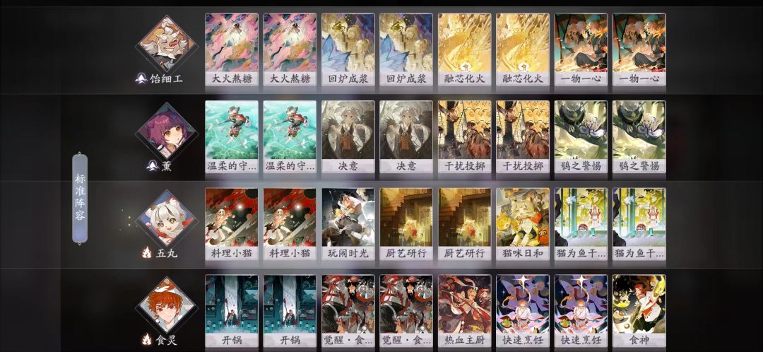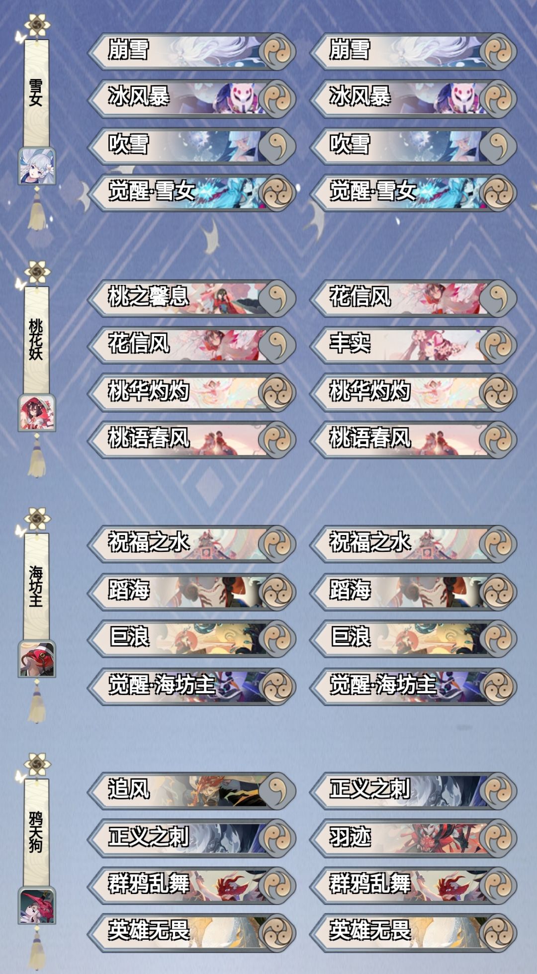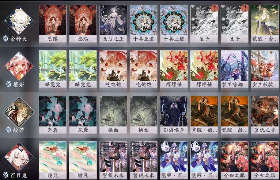 蛇鹿火佛 1、蛇鹿、两面佛、铃鹿、凤凰的紫卡,橙卡是合的; 2、新手预组选第一个可以白嫖一张凤凰的橙卡; 3、铃鹿卡不全,用的是新手给的7天式神体验礼包; 4、两面佛抽卡包解锁以后,4张紫卡也是合的 抢血就完了,注意几个组合技 1、清姬淬毒+焚身 全场打7+5盐,秒场必备 2、铃鹿斩杀要算一算,觉醒状态直接用义道是8血起步,清姬踢一脚上4破甲后是12血起步 3、清姬先踢一脚,铃鹿紧接 无往+白刃,