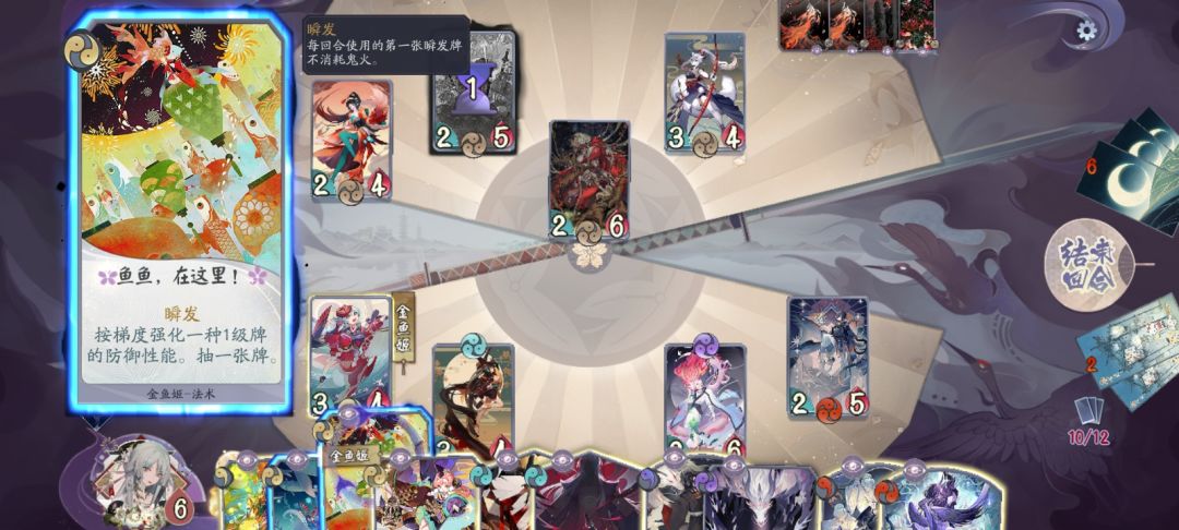 第一步,金鱼瞬发过牌 第二步,一目上2个形态,造成+3加成。第一回合过 第三步,妖刀打死骷髅,两张攻击带走对面