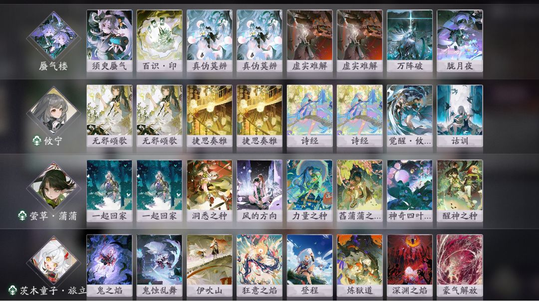 松能稳定连引到攸宁的换人卡,这样能在一勾就能以4,5张蜃气楼的牌换到大量的其他式神的手牌。 松的幻境在其他角色都被解的时候,既可以限制对面的输出,也能提供一定的斩杀能力。 奕的过牌和ssr可以让攸宁的形态和换人稳定上手。 由于攸宁换人等于复活,蜃气楼可以一勾就送上去卖。而新队友,只要不强,被解的时候就果断换上新人复活。 换人尽可能选那些有大身材,或者法术牌多的强力输出,发育型和辅助式神能不选就不选