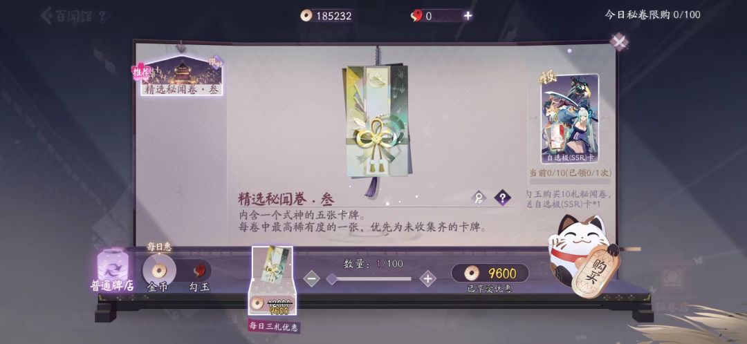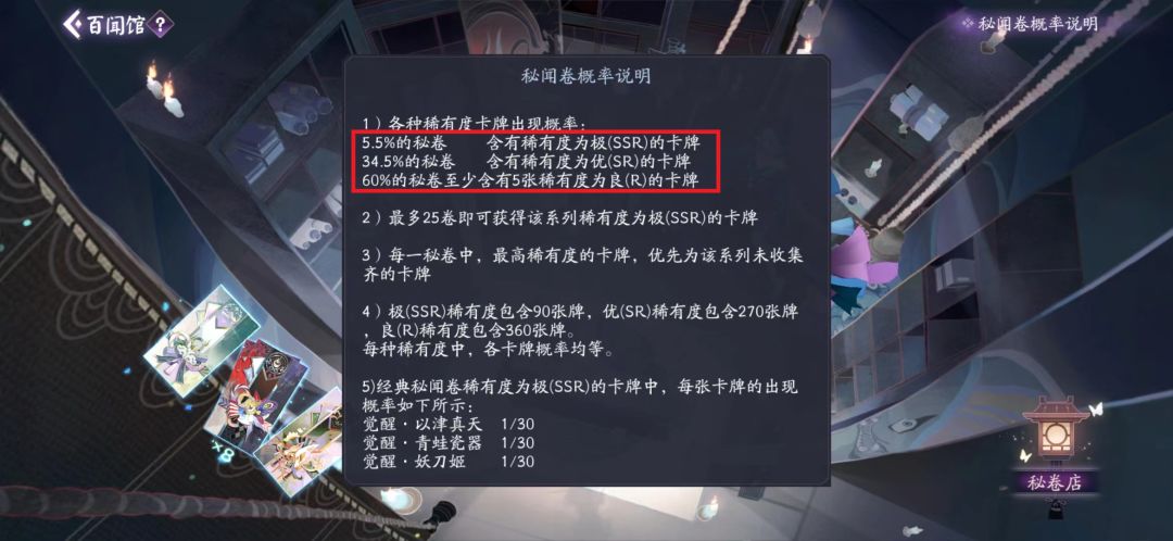 一、先了解三个规则。 1、限时,不是长驻卡包。 新的秘闻卷上架,旧的秘闻卷会下架。 壹是7月13日;贰是10月26日,间隔3个月13天;叁是1月25日,间隔3个月。 我先默认有3个月吧。这个周期只足够充游览卡的新人抽满普通卡包8个式神,这个卡包是两倍,远远不够。 2、金币购买的话有每日三札8折优惠,且与普通牌店的优惠是分开计算的。 但是,并不推荐萌新抽哦。第一个卡包重点还是放在桃园故里/远山遥泽。