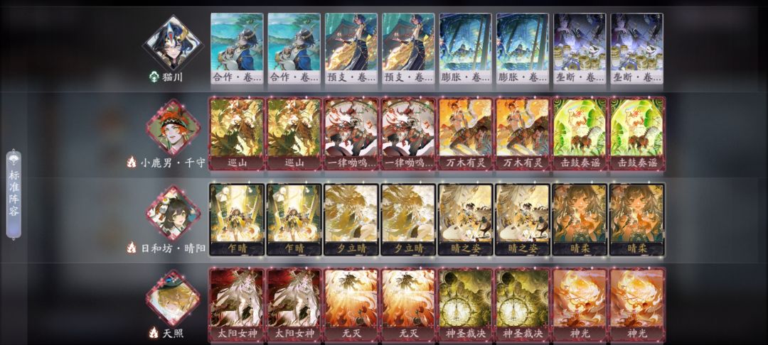 哈喽家人们大家好呀,这里是一盏龙井温月乡(〃'▽'〃) 本期卡组推荐还是围绕晴鹿展开的,只是把御馔津的位置换成了猫川 理由:启荒横行的版本,鹿守仅靠自己几乎是无法完成发育的,送又送不掉,那怎么办呢? 猫川来告诉你答案 ■卡组留牌 日和坊除了二勾晴柔都可以开局留下来 鹿守ssr和觉醒遇到必留,其余四张战斗牌要看对面构筑决定,如果是快攻就不要留三勾战斗牌,如果有攸宁诗经,玉藻前,之类一勾就开始发力需要