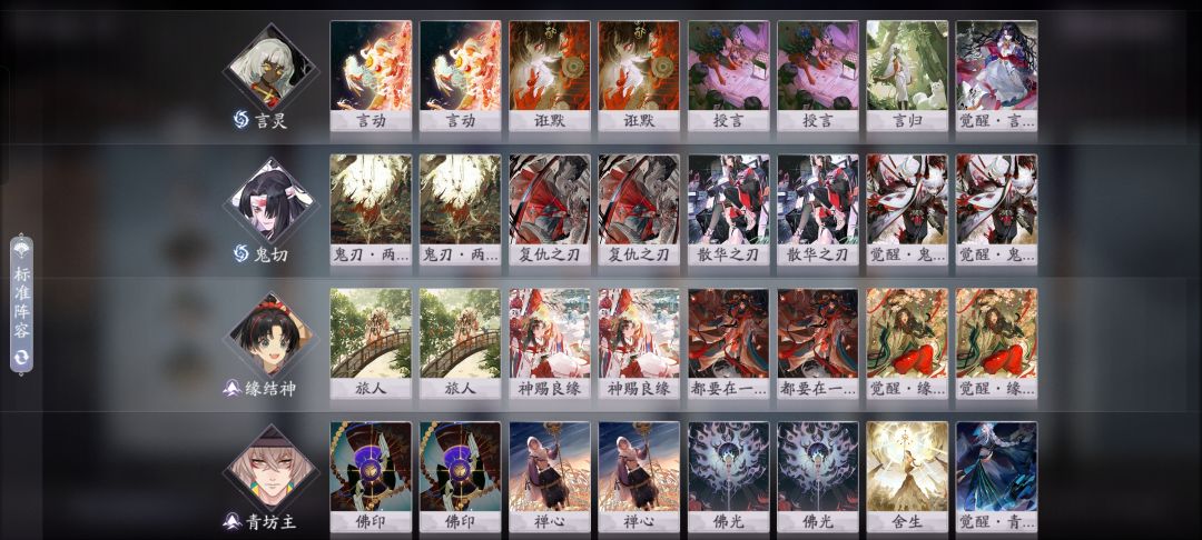 你就玩吧一玩一个不吱声 阵容名: 言灵 觉醒·言灵 (1) 言动 (2) 诳默 (2) 授言 (2) 言归 (1) 鬼切 散华之刃 (2) 复仇之刃 (2) 觉醒·鬼切 (2) 鬼刃·两断 (2) 缘结神 觉醒·缘结神 (2) 旅人 (2) 神赐良缘 (2) 都要在一起! (2) 青坊主 觉醒·青坊主 (1) 舍生 (1) 佛印 (2) 禅心 (2) 佛光 (2) 阵容码:Ml8xMDFfMTUw
