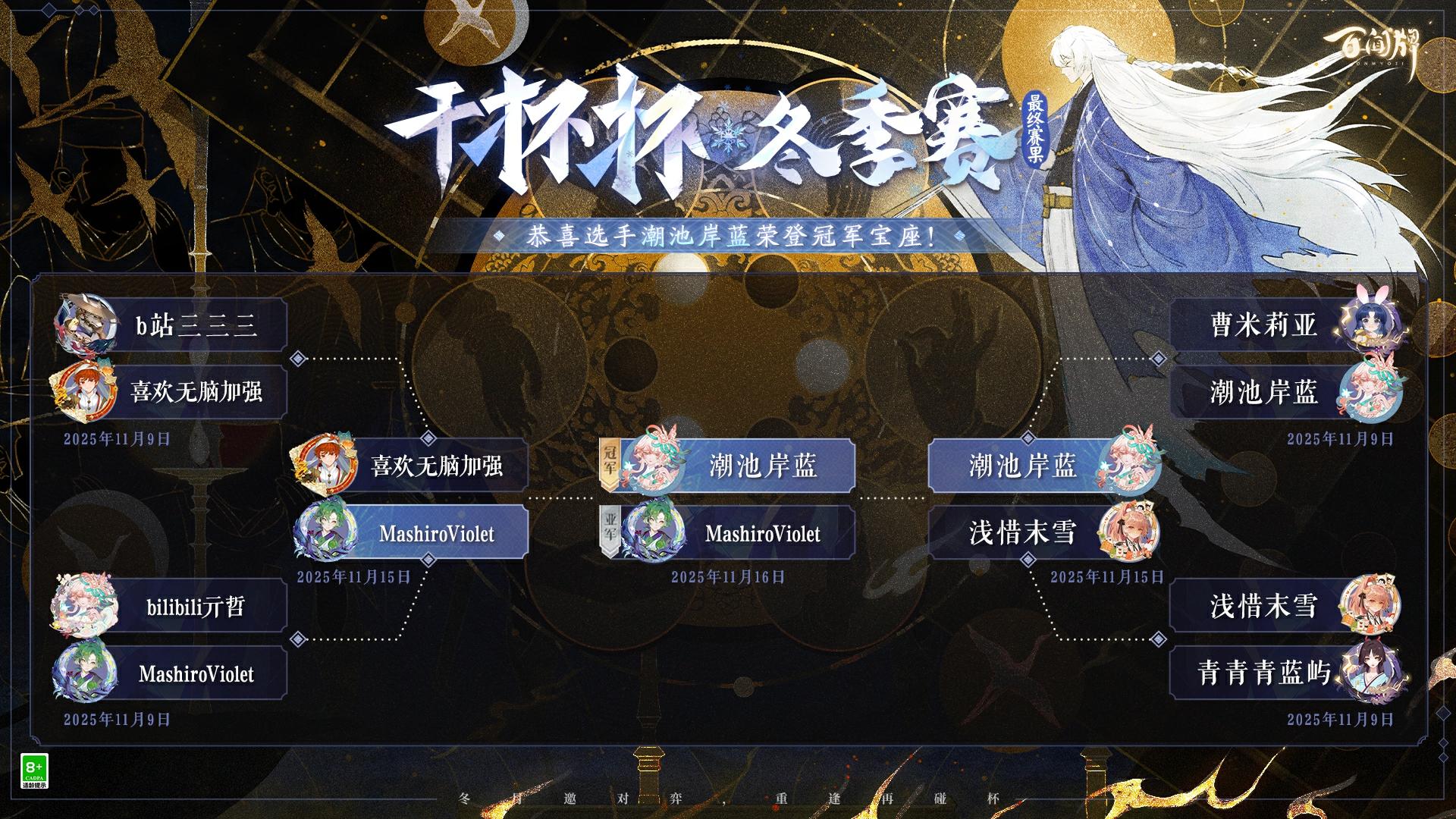直达巅峰,不惧严寒!弈者们紧锁的眉峰倏地舒展,那眸底的迷雾刹那间云开雾散,干杯杯冬季赛现已落下帷幕,八强选手们的比拼现也已决出胜负!让我们一起恭喜选手【潮池岸蓝】夺得干杯杯·冬季赛的冠军,荣获限定称号——「干杯杯·衔雪凝香」!!! 同时也祝贺选手【MashiroViolet】夺得比赛亚军,荣获限定称号「干杯杯·探梅」;选手【喜欢无脑加强】夺得比赛季军,荣获限定称号「
