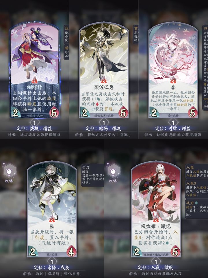 最近因为牌停更,部分回归玩家及新入坑玩家不熟悉环境,故出此指南。牌卡组一般分快攻(抢血),中速(二勾发力),慢速(三勾发力),如果卡在对面三勾前(己方先手的话就是己方升三勾的回合,己方后手就是全部升二勾的回合)把核心式神击杀,可以起到打乱对面节奏或者苟延残喘的机会。指南主要为单核阵容制造,如有补充,欢迎评论区交流。1.凤凰火 三勾炎舞启动容易斩杀2.跳跳妹妹 少见式神,阵容核心,三勾觉醒配合