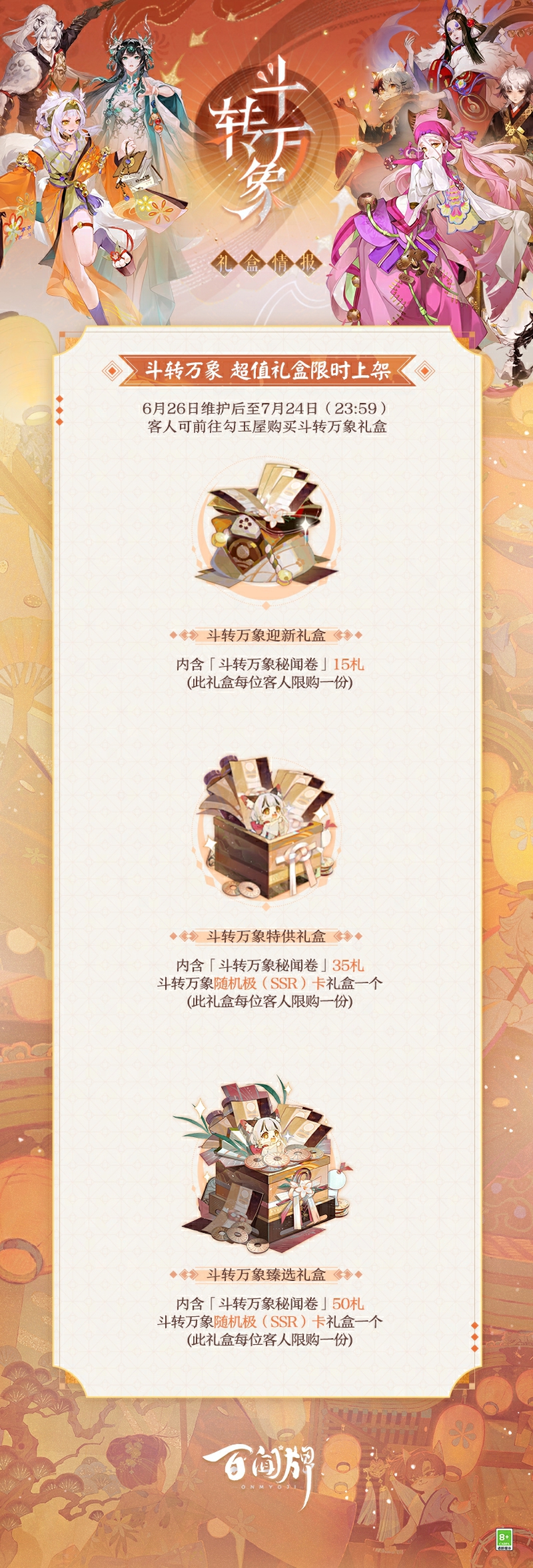 ● 福佑随风至,诸邪尽退散 原创式神 贫乏神;全新式神招财猫、龙珏、封阳君、禅心云外镜、烬天玉藻前以及重置式神 猫掌柜·焕宴现已登船! 瓦当俱碎,奇异灾厄阁中藏;金铃清响,迎福纳财祥瑞来!尘过不扰,云过无心。玉影烬舞,狐火长明。奇妙的故事在不经意间碰撞,蜃境浮光中的奇趣轶事不断交互,就让美好的仲夏长篇继续铺展吧! ● 登船免费领取3札「斗转万象秘闻卷」 新资料片现已上线,各位客人登录游戏即