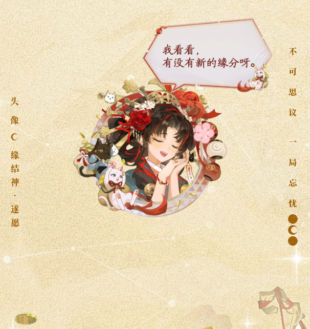 绯樱纷飞,纸灯摇曳,小缘蹦蹦跳跳穿过人群来到结缘神社,腰间的金铃“叮叮当当”响个不停。她开始审视刚系上的祈愿绘马——「想吃小松丸藏起来的松果」「想用河童头顶的荷叶碗」……呜哇!这是谁的恶作剧!?神明大人看到了可是会生气的喔! [表情_翻白眼] 〓全新礼盒「与世结缘」上线〓 勾玉屋上新!全新礼盒「与世结缘」现已上架勾玉屋(内含头像「缘结神·遂愿」和头像框「与世结缘」),同时开启限时特惠。欢迎各位客人
