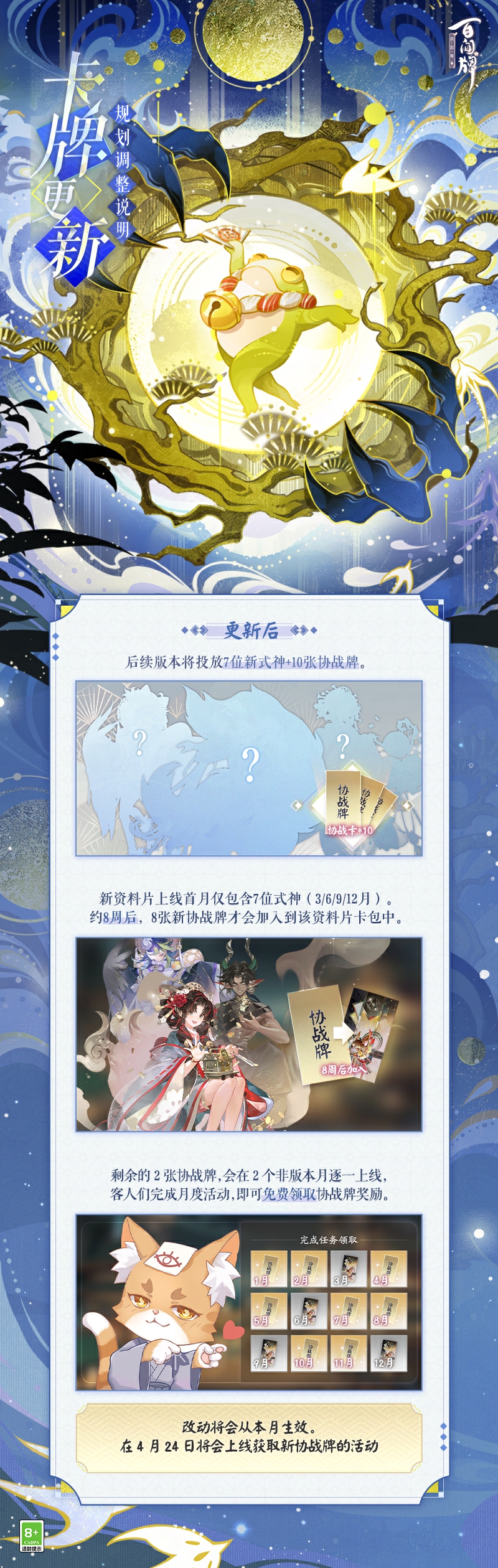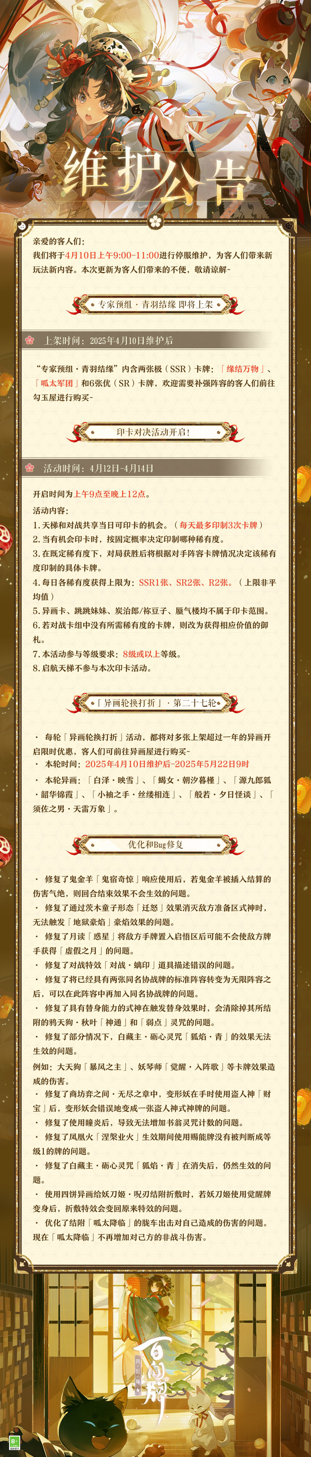 碧呱跃动,朱绳缠连。全新预组礼盒【专家预组·青羽结缘】已于4月10日上架勾玉屋,内含两张极(SSR)卡牌!引铃结缘缔福运,胧车呱太齐上阵!愿客人们在日常的牌局中,逢“缘”攀青云,乘“车”步高升!~ ———专家预组·青羽结缘—— ● 内含极(SSR)卡牌:「缘结万物」、「呱太军团」 ● 内含优(SR)卡牌:缘祝×1、天降良缘×1、终舞x2、保养时间×2 轻戳下方视频即可查看卡组对局展示~↓↓↓ #阴