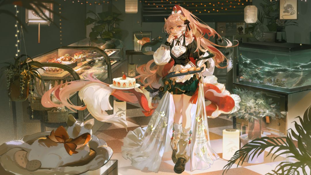 水果布丁、提拉米苏、红豆蛋挞…… 还是少女头顶的那对可爱的“龙角包”? 午后暖阳透过轻纱,将琳琅满目的甜品烘托得更为诱人; 轻盈精巧的慕斯,多彩的颜色下汇聚着香甜的气息; 龙尾托举着的奶油蛋糕,鲜果如红宝石般点缀其上; 各种如珍宝般闪耀的甜品,或清甜绵软,或咸香酥脆; 它们静静地躺在展柜,待客人一口咬下,感受舌尖上的美好绽放~ 它们就是少女那烘焙坊中, 能用甜蜜融化所有烦恼的小小宝藏~ #阴阳师百