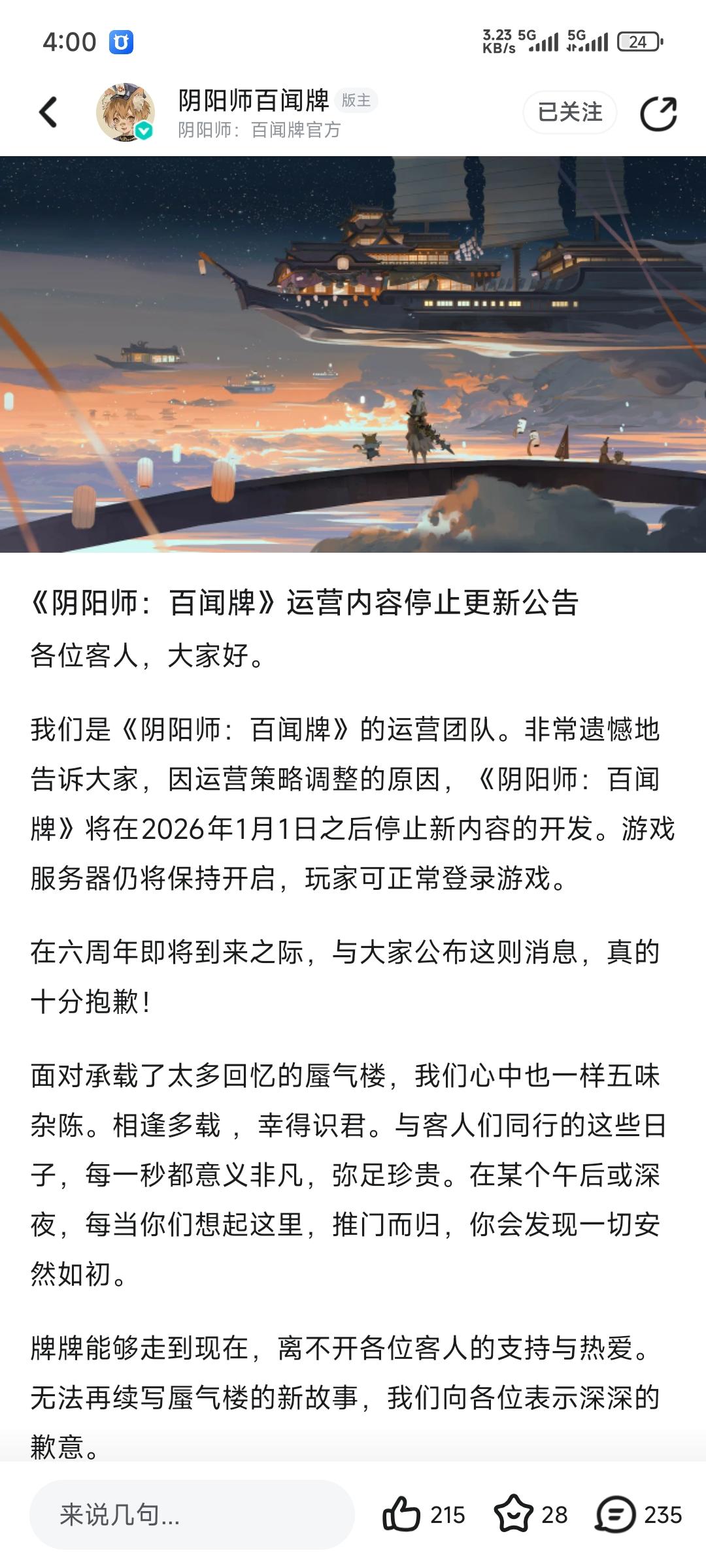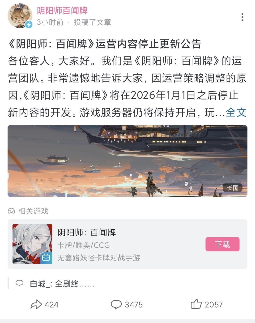 #阴阳师百闻牌官宣停运 #阴阳师百闻牌 #阴阳师 近日,网易旗下基于《阴阳师》IP开发的卡牌对战游戏《阴阳师:百闻牌》,于11月28日通过官方渠道发布公告,正式宣布游戏将于2026年1月1日之后停止新内容的开发,这意味着这款自2019年12月12日上线,即将迎来六周年的游戏,将进入“停更不停服”的状态,官方承诺服务器会继续保持开启玩家仍可登录体验已有内容,并且暂无停止运营的计划,虽然百闻牌没有新